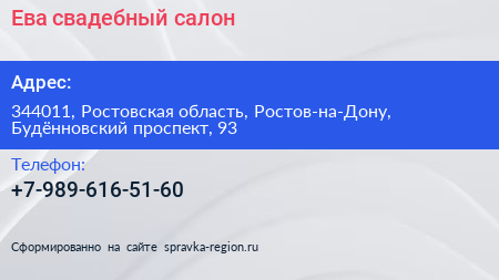 Ева, свадебный салон по адресу 344011, Ростовская область, Ростов-на-Дону, Будённовский проспект, 93 в дальнейшем Организация, размещена в следующих категориях: