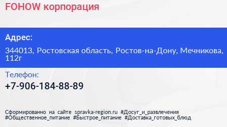 FOHOW, корпорация по адресу 344013, Ростовская область, Ростов-на-Дону, Мечникова, 112г в дальнейшем Организация, размещена в следующих категориях: