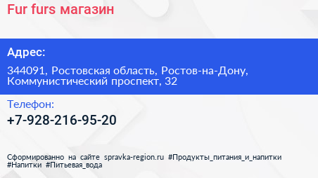 Fur furs, магазин по адресу 344091, Ростовская область, Ростов-на-Дону, Коммунистический проспект, 32 в дальнейшем Организация, размещена в следующих категориях: