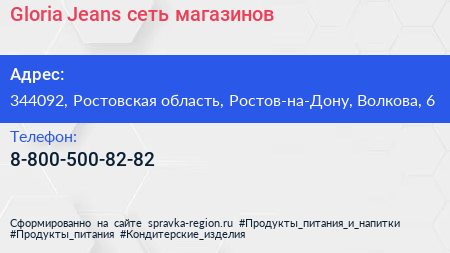 Gloria Jeans, сеть магазинов по адресу 344092, Ростовская область, Ростов-на-Дону, Волкова, 6 в дальнейшем Организация, размещена в следующих категориях: