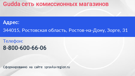 Gudda, сеть комиссионных магазинов по адресу 344015, Ростовская область, Ростов-на-Дону, Зорге, 31 в дальнейшем Организация, размещена в следующих категориях: