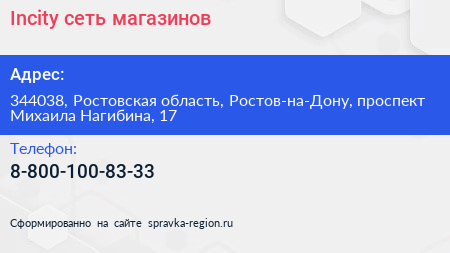 Incity, сеть магазинов по адресу 344038, Ростовская область, Ростов-на-Дону, проспект Михаила Нагибина, 17 в дальнейшем Организация, размещена в следующих категориях: