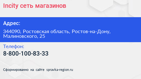 Incity, сеть магазинов по адресу 344090, Ростовская область, Ростов-на-Дону, Малиновского, 25 в дальнейшем Организация, размещена в следующих категориях: