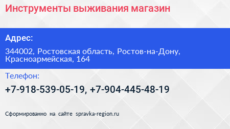 Инструменты выживания, магазин по адресу 344002, Ростовская область, Ростов-на-Дону, Красноармейская, 164 в дальнейшем Организация, размещена в следующих категориях: