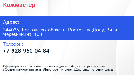 Кожмастер по адресу 344025, Ростовская область, Ростов-на-Дону, Вити Черевичкина, 103 в дальнейшем Организация, размещена в следующих категориях: