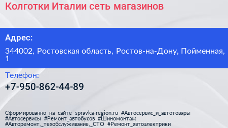 Колготки Италии, сеть магазинов по адресу 344002, Ростовская область, Ростов-на-Дону, Пойменная, 1 в дальнейшем Организация, размещена в следующих категориях: