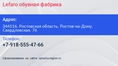 Lefaro, обувная фабрика по адресу 344116, Ростовская область, Ростов-на-Дону, Свердловская, 76 в дальнейшем Организация, размещена в следующих категориях: