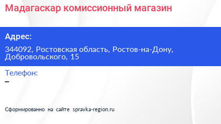 Мадагаскар, комиссионный магазин по адресу 344092, Ростовская область, Ростов-на-Дону, Добровольского, 15 в дальнейшем Организация, размещена в следующих категориях: