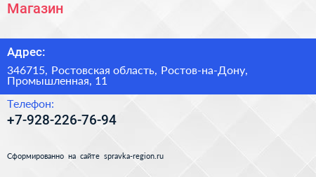 Магазин по адресу 346715, Ростовская область, Ростов-на-Дону, Промышленная, 11 в дальнейшем Организация, размещена в следующих категориях: