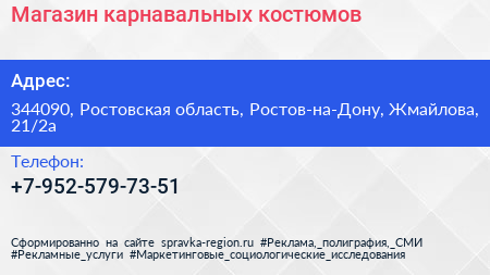 Магазин карнавальных костюмов по адресу 344090, Ростовская область, Ростов-на-Дону, Жмайлова, 21/2а в дальнейшем Организация, размещена в следующих категориях: