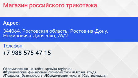 Магазин российского трикотажа по адресу 344064, Ростовская область, Ростов-на-Дону, Немировича-Данченко, 76/2 в дальнейшем Организация, размещена в следующих категориях: