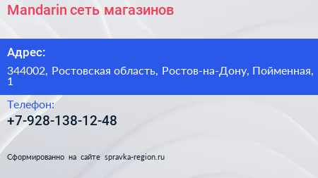 Mandarin, сеть магазинов по адресу 344002, Ростовская область, Ростов-на-Дону, Пойменная, 1 в дальнейшем Организация, размещена в следующих категориях: