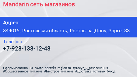 Mandarin, сеть магазинов по адресу 344015, Ростовская область, Ростов-на-Дону, Зорге, 33 в дальнейшем Организация, размещена в следующих категориях: