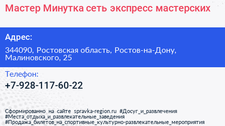 Мастер Минутка, сеть экспресс-мастерских по адресу 344090, Ростовская область, Ростов-на-Дону, Малиновского, 25 в дальнейшем Организация, размещена в следующих категориях: