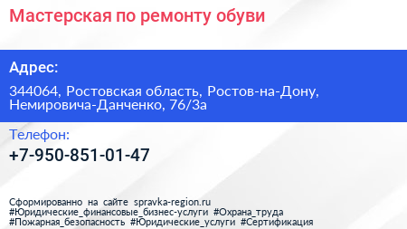 Мастерская по ремонту обуви по адресу 344064, Ростовская область, Ростов-на-Дону, Немировича-Данченко, 76/3а в дальнейшем Организация, размещена в следующих категориях: