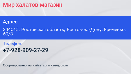 Мир халатов, магазин по адресу 344015, Ростовская область, Ростов-на-Дону, Ерёменко, 60/3 в дальнейшем Организация, размещена в следующих категориях: