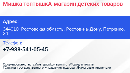 Мишка топтышкА, магазин детских товаров по адресу 344010, Ростовская область, Ростов-на-Дону, Петренко, 24 в дальнейшем Организация, размещена в следующих категориях: