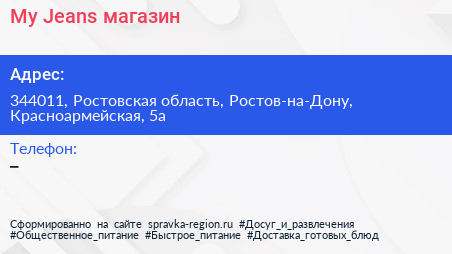 My Jeans, магазин по адресу 344011, Ростовская область, Ростов-на-Дону, Красноармейская, 5а в дальнейшем Организация, размещена в следующих категориях: