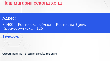 Наш магазин, секонд-хенд по адресу 344002, Ростовская область, Ростов-на-Дону, Красноармейская, 126 в дальнейшем Организация, размещена в следующих категориях: