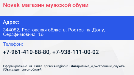 Novak, магазин мужской обуви по адресу 344082, Ростовская область, Ростов-на-Дону, Серафимовича, 16 в дальнейшем Организация, размещена в следующих категориях: