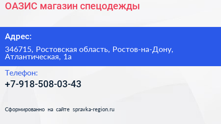 ОАЗИС, магазин спецодежды по адресу 346715, Ростовская область, Ростов-на-Дону, Атлантическая, 1а в дальнейшем Организация, размещена в следующих категориях:
