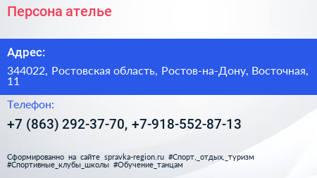 Персона, ателье по адресу 344022, Ростовская область, Ростов-на-Дону, Восточная, 11 в дальнейшем Организация, размещена в следующих категориях: