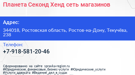 Планета Секонд Хенд, сеть магазинов по адресу 344018, Ростовская область, Ростов-на-Дону, Текучёва, 238 в дальнейшем Организация, размещена в следующих категориях: