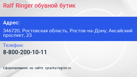 Ralf Ringer, обувной бутик по адресу 346720, Ростовская область, Ростов-на-Дону, Аксайский проспект, 23 в дальнейшем Организация, размещена в следующих категориях: