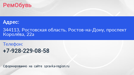 РемОбувь по адресу 344113, Ростовская область, Ростов-на-Дону, проспект Королёва, 22а в дальнейшем Организация, размещена в следующих категориях: