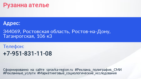 Рузанна, ателье по адресу 344069, Ростовская область, Ростов-на-Дону, Таганрогская, 106 к3 в дальнейшем Организация, размещена в следующих категориях:
