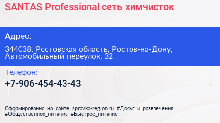 SANTAS Professional, сеть химчисток по адресу 344038, Ростовская область, Ростов-на-Дону, Автомобильный переулок, 32 в дальнейшем Организация, размещена в следующих категориях: