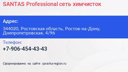 SANTAS Professional, сеть химчисток по адресу 344020, Ростовская область, Ростов-на-Дону, Днепропетровская, 4/96 в дальнейшем Организация, размещена в следующих категориях: