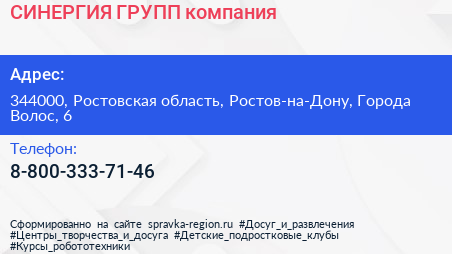 СИНЕРГИЯ ГРУПП, компания по адресу 344000, Ростовская область, Ростов-на-Дону, Города Волос, 6 в дальнейшем Организация, размещена в следующих категориях: