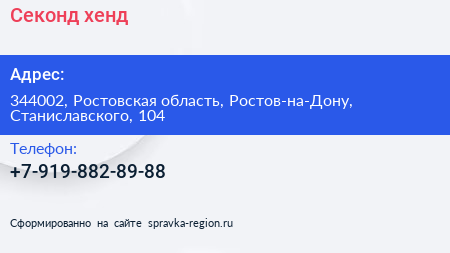 Секонд-хенд по адресу 344002, Ростовская область, Ростов-на-Дону, Станиславского, 104 в дальнейшем Организация, размещена в следующих категориях: