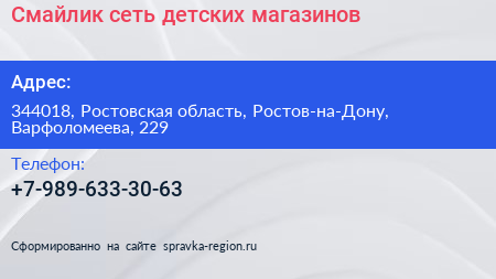 Смайлик, сеть детских магазинов по адресу 344018, Ростовская область, Ростов-на-Дону, Варфоломеева, 229 в дальнейшем Организация, размещена в следующих категориях: