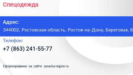 Спецодежда по адресу 344002, Ростовская область, Ростов-на-Дону, Береговая, 8 в дальнейшем Организация, размещена в следующих категориях: