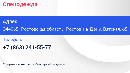 Спецодежда по адресу 344065, Ростовская область, Ростов-на-Дону, Вятская, 65 в дальнейшем Организация, размещена в следующих категориях: