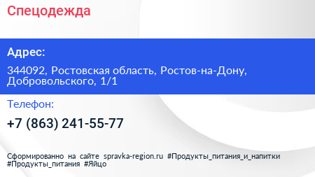 Спецодежда по адресу 344092, Ростовская область, Ростов-на-Дону, Добровольского, 1/1 в дальнейшем Организация, размещена в следующих категориях: