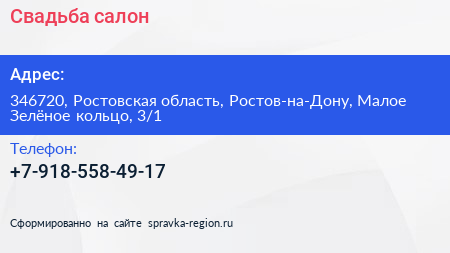 Свадьба, салон по адресу 346720, Ростовская область, Ростов-на-Дону, Малое Зелёное кольцо, 3/1 в дальнейшем Организация, размещена в следующих категориях:
