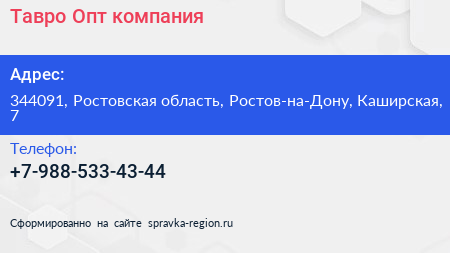 Тавро Опт, компания по адресу 344091, Ростовская область, Ростов-на-Дону, Каширская, 7 в дальнейшем Организация, размещена в следующих категориях:
