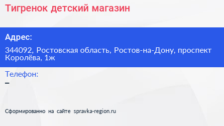 Тигренок, детский магазин по адресу 344092, Ростовская область, Ростов-на-Дону, проспект Королёва, 1ж в дальнейшем Организация, размещена в следующих категориях: