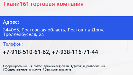 Ткани161, торговая компания по адресу 344065, Ростовская область, Ростов-на-Дону, Троллейбусная, 2а в дальнейшем Организация, размещена в следующих категориях: