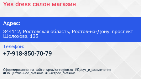 Yes dress, салон-магазин по адресу 344112, Ростовская область, Ростов-на-Дону, проспект Шолохова, 135 в дальнейшем Организация, размещена в следующих категориях: