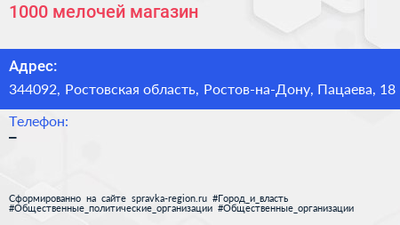 1000 мелочей, магазин по адресу 344092, Ростовская область, Ростов-на-Дону, Пацаева, 18 в дальнейшем Организация, размещена в следующих категориях: