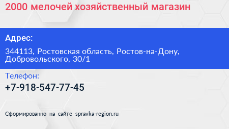 2000 мелочей, хозяйственный магазин по адресу 344113, Ростовская область, Ростов-на-Дону, Добровольского, 30/1 в дальнейшем Организация, размещена в следующих категориях: