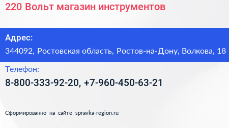220 Вольт, магазин инструментов по адресу 344092, Ростовская область, Ростов-на-Дону, Волкова, 18 в дальнейшем Организация, размещена в следующих категориях: