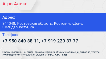 Агро-Алекс по адресу 344048, Ростовская область, Ростов-на-Дону, Солидарности, 2а в дальнейшем Организация, размещена в следующих категориях: