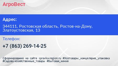 АгроВест по адресу 344111, Ростовская область, Ростов-на-Дону, Златоустовская, 13 в дальнейшем Организация, размещена в следующих категориях:
