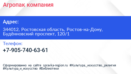 Агропак, компания по адресу 344012, Ростовская область, Ростов-на-Дону, Будённовский проспект, 120/1 в дальнейшем Организация, размещена в следующих категориях: