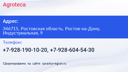 Agroteca по адресу 346715, Ростовская область, Ростов-на-Дону, Индустриальная, 9 в дальнейшем Организация, размещена в следующих категориях: